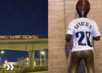 Nesta quinta-feira (26), torcedores do Atlético de Madrid penduraram um boneco horrível do atacante do Real Madrid , Vinicius Jr, ...