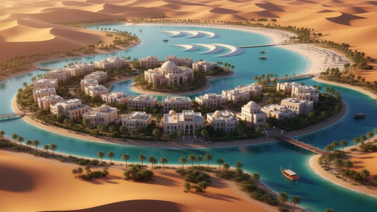 | Objetivo | Criar uma nova linha costeira artificial, transformando o deserto em uma cidade navegável com acesso ao mar. |