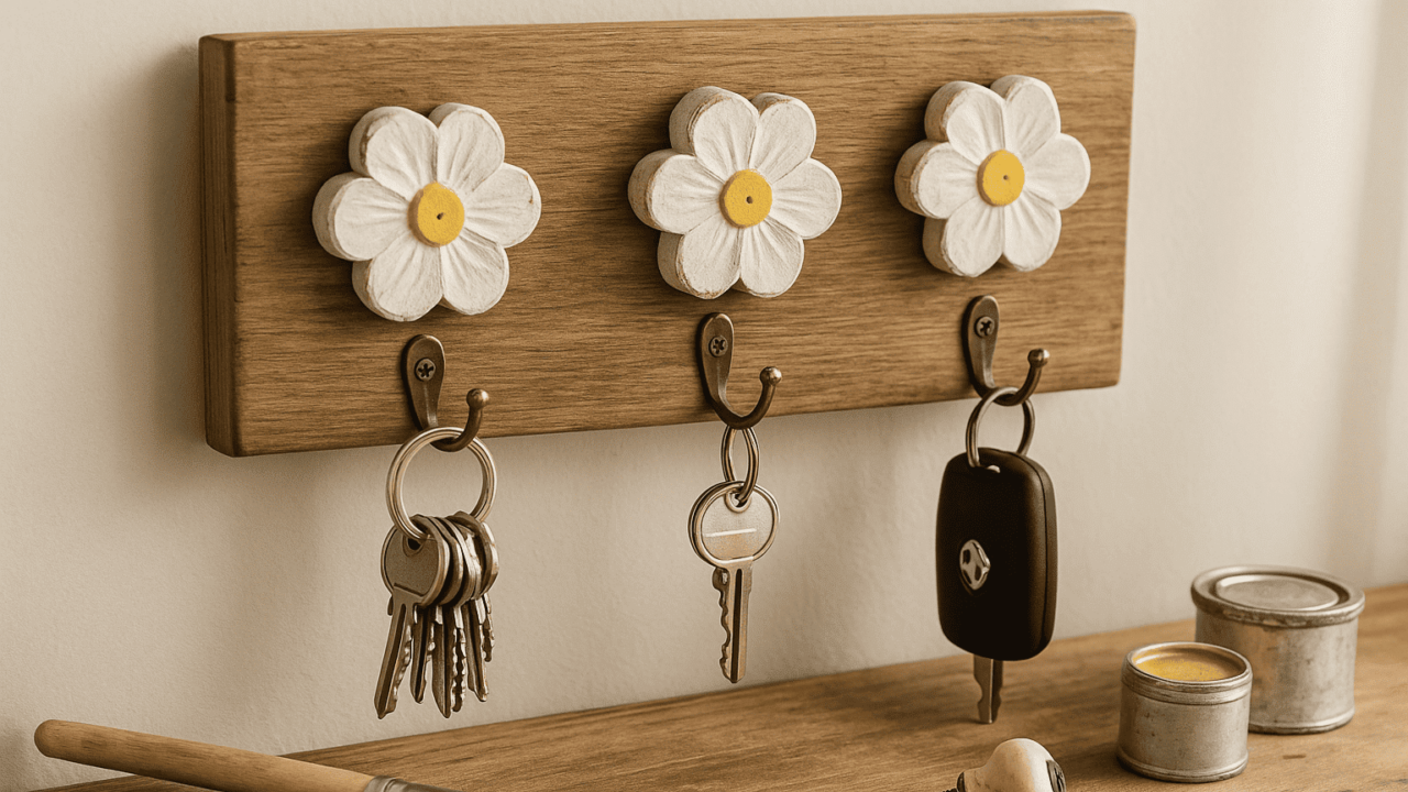 Você pode reaproveitar puxadores de móveis, ganchos antigos ou comprar modelos decorativos em lojas de ferragens. A escolha vai conforme o estilo desejado e o peso das chaves.