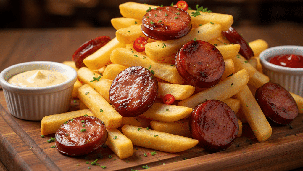 A origem desse prato não é completamente clara, mas a suposição mais aceita é que ele nasceu da inovação culinária brasileira. Nos bares e lanchonetes, o objetivo sempre foi criar pratos que fossem tanto deliciosos quanto fáceis de preparar, surgindo assim a ideia de casar a textura macia e ao mesmo tempo crocante das batatas com a intensidade de uma linguiça bem temperada. Essa combinação logo ganhou adeptos e se estabeleceu como uma das preferidas nos botecos por todo o Brasil.