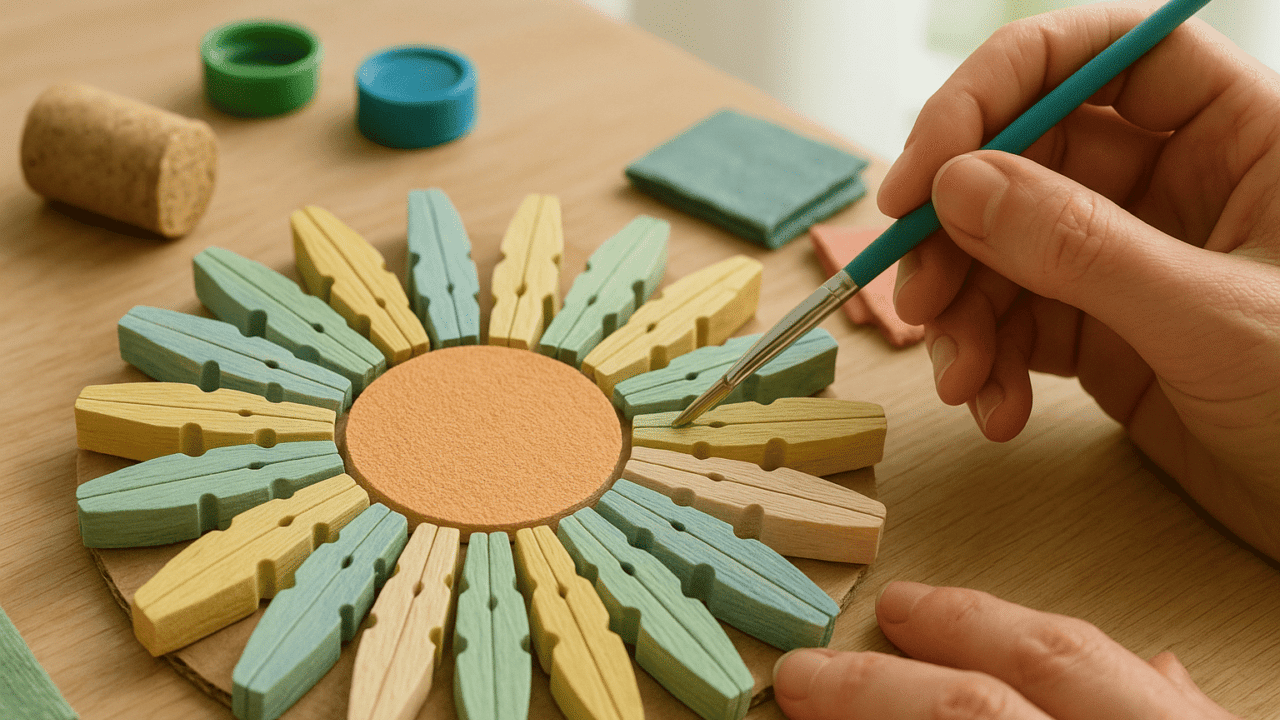 Uma das formas mais simples e eficazes de confeccionar um descanso de panela é reutilizando papelão e pregadores, materiais que muitos têm sobrando em casa. Inicie cortando um círculo de papelão do tamanho desejado; será a base do descanso. Em seguida, desmonte pregadores de madeira, separando-os em duas partes.