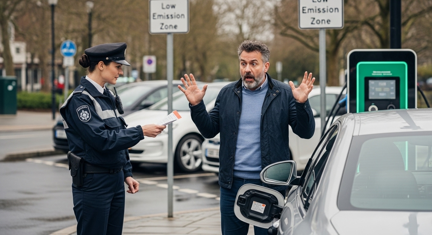Homem recebendo multa não possuir carro elétrico ou híbrido