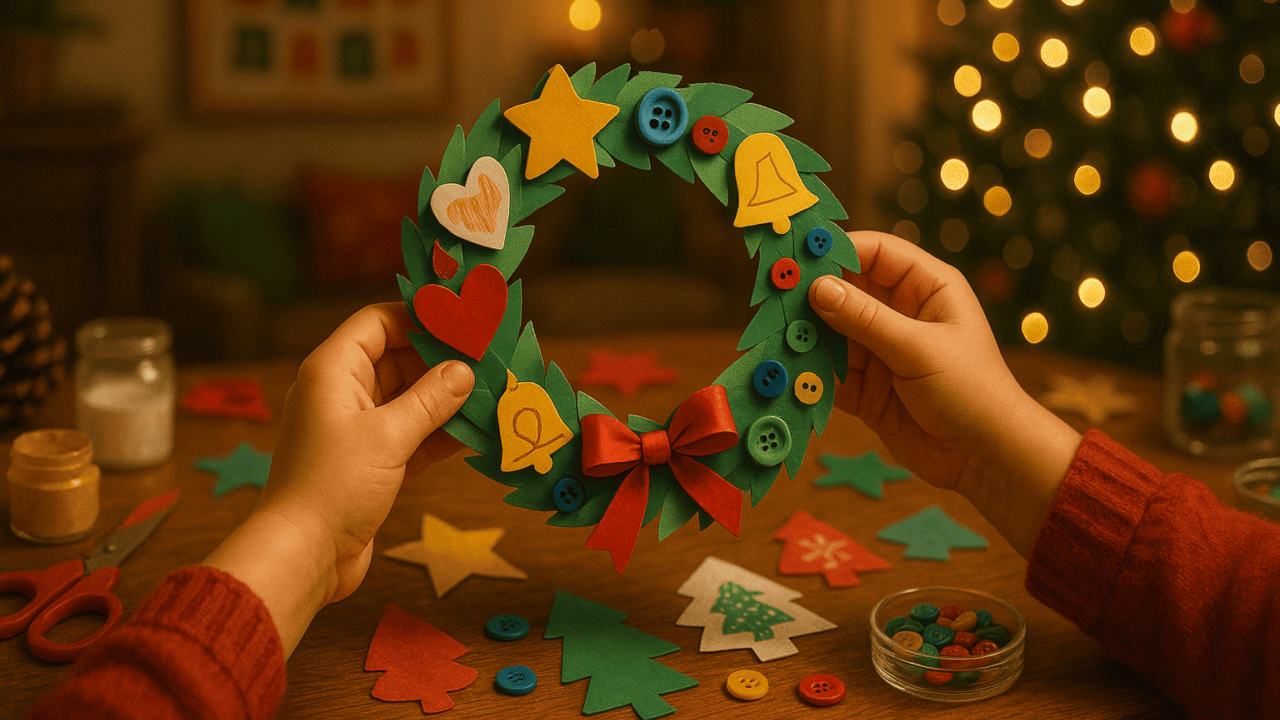 Criança decorando guirlanda de Natal artesanal com papel colorido