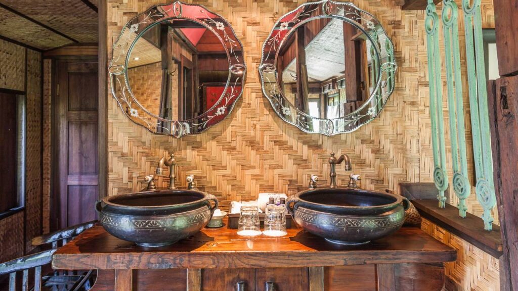 Quadros, vinis expostos, espelhos redondos e pequenos objetos de época completam a composição e criam uma atmosfera nostálgica.