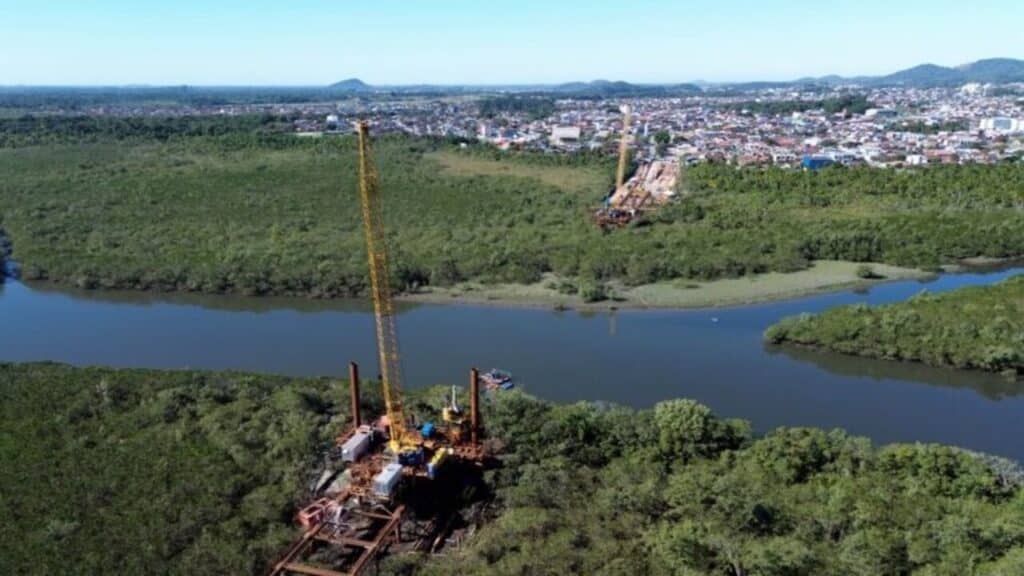 • Uso de tecnologia inovadora: A construção emprega tecnologia inédita na cidade, como a estrutura cantitravel, que facilita a execução das estacas e a montagem da ponte, além de contribuir para a preservação ambiental ao minimizar o impacto no ecossistema local.