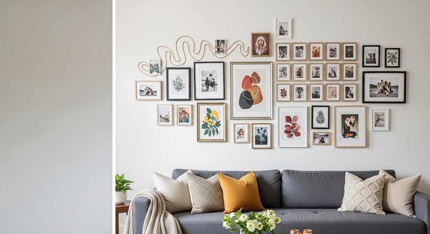Limite a quantidade de quadros, escolha uma paleta de cores harmônica e mantenha espaçamento entre as peças para garantir uma composição leve e agradável.