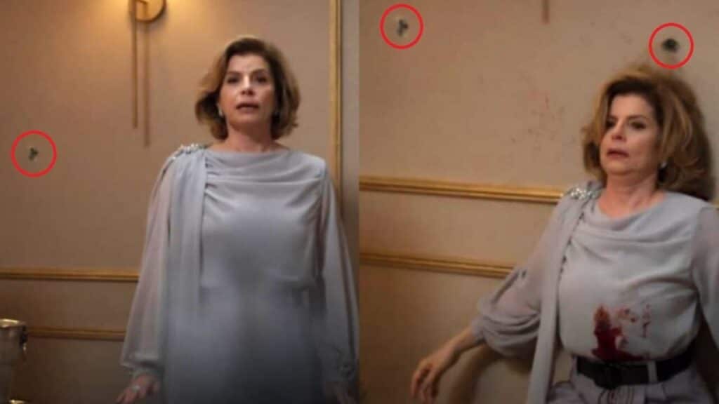 A cena que marcou a morte de Odete Roitman é repleta de detalhes que contribuem para a construção do mistério em torno de seu assassinato. Quando a vilã é alvejada em sua suíte no Copacabana Palace, uma observação atenta revela algo curioso: há dois buracos de bala na parede atrás dela, indicando que houve uma tentativa de disparo falha antes do tiro fatal.