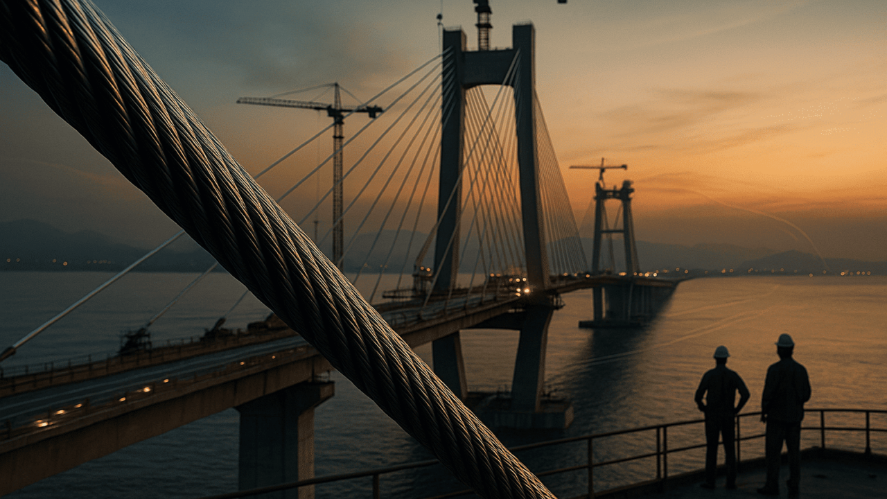 Além disso, iniciou-se a instalação dos estais, cabos de aço que sustentam a parte principal da ponte. Essa etapa é essencial para garantir a estabilidade e suportar o peso do tabuleiro durante as próximas fases de construção.