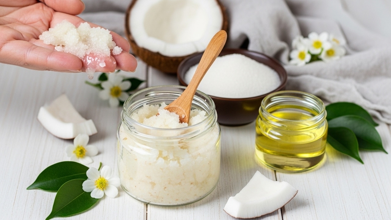 • Açúcar e Óleo de Coco: Misture duas colheres de sopa de açúcar com uma colher de óleo de coco até formar uma pasta homogênea. Esse esfoliante ajuda a remover células mortas e hidrata profundamente, ideal para peles secas.