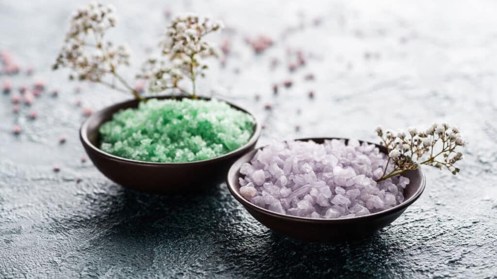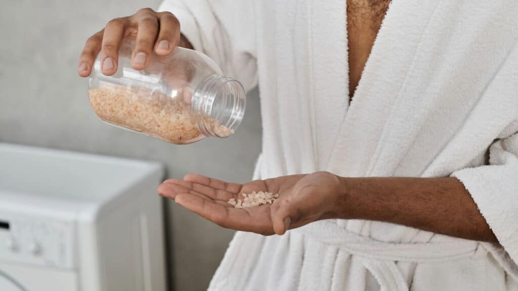 - Adicione 2 a 3 colheres de sal grosso à água ou despeje em um balde para banho tradicional.