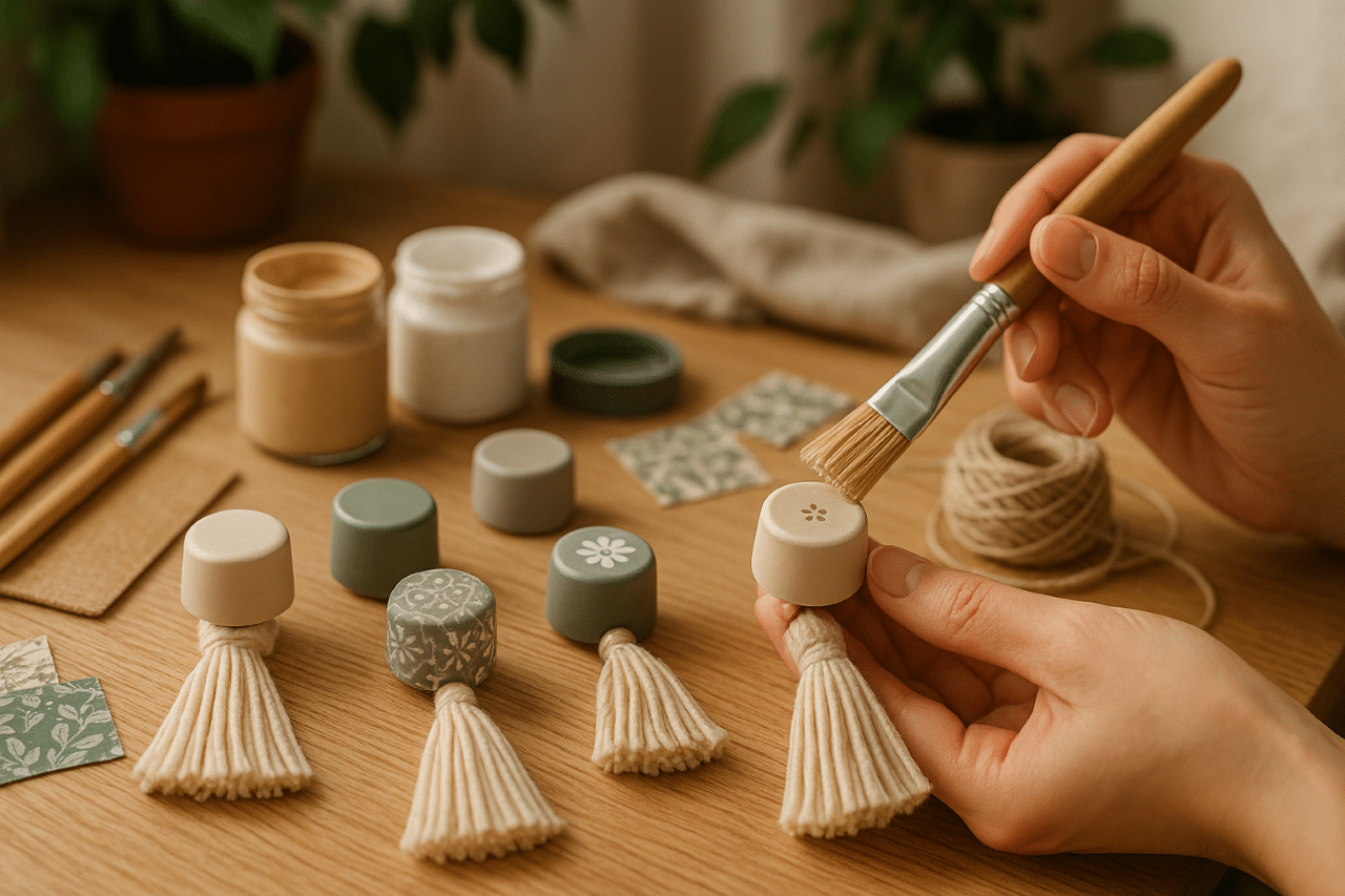 O preparo dos tassels decorativos começa com a criação de um orifício em cada tampinha, facilitando a passagem do cordão. Após pintar as tampinhas, é possível aplicar o papel decorativo e obter um acabamento limpo e detalhado utilizando a lixa fina.