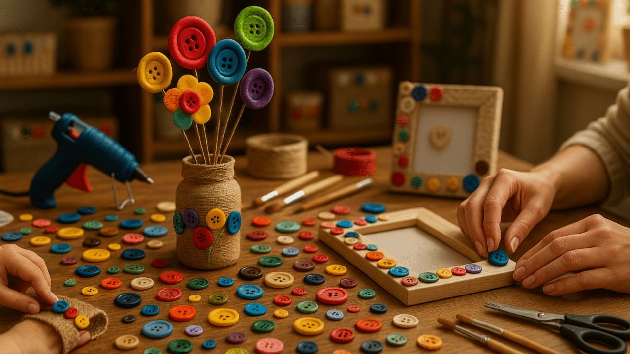 Botões vêm em diferentes formas, tamanhos, cores e texturas, sendo versáteis para artesanato. Eles podem personalizar e trazer estilo para vários ambientes da casa, oferecendo um toque inovador e acolhedor sem a necessidade de comprar novos adornos.