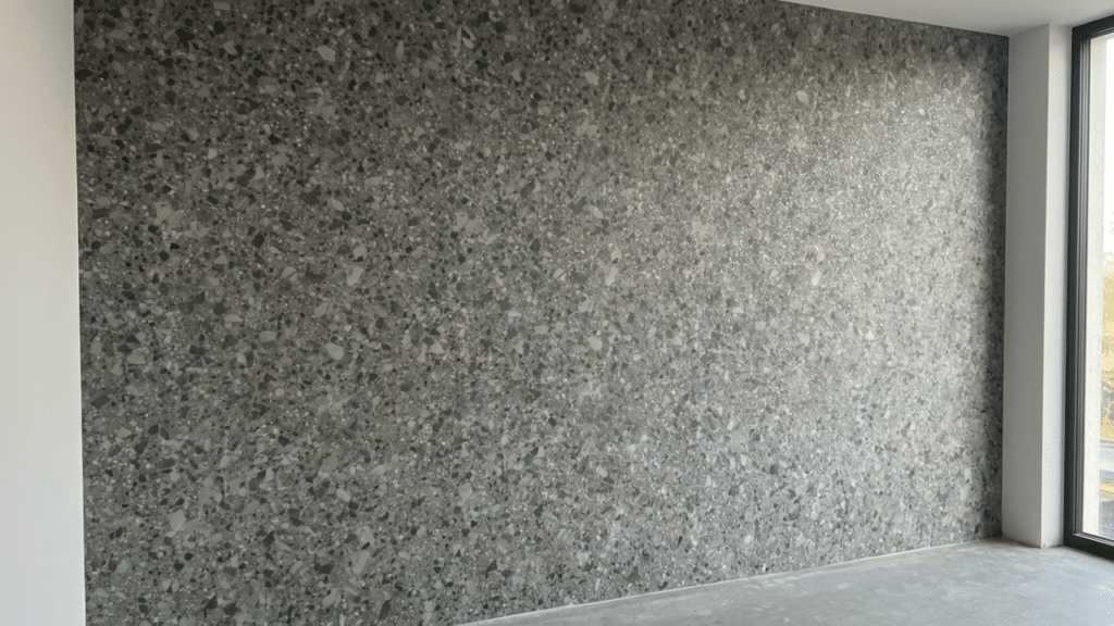 Papel de parede líquido imita granito, com aplicação rápida e acabamento sem emendas.