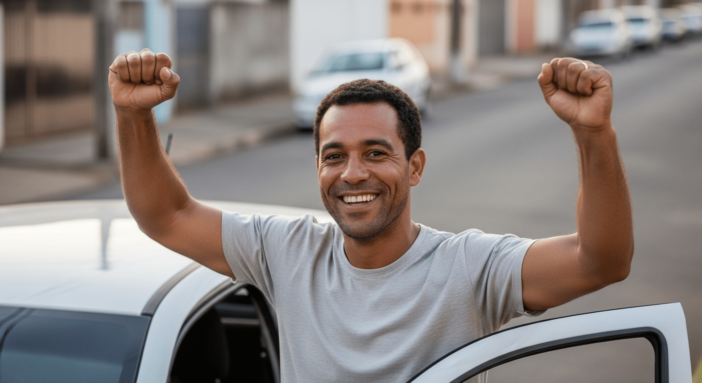 Motorista contente ao lado do seu carro