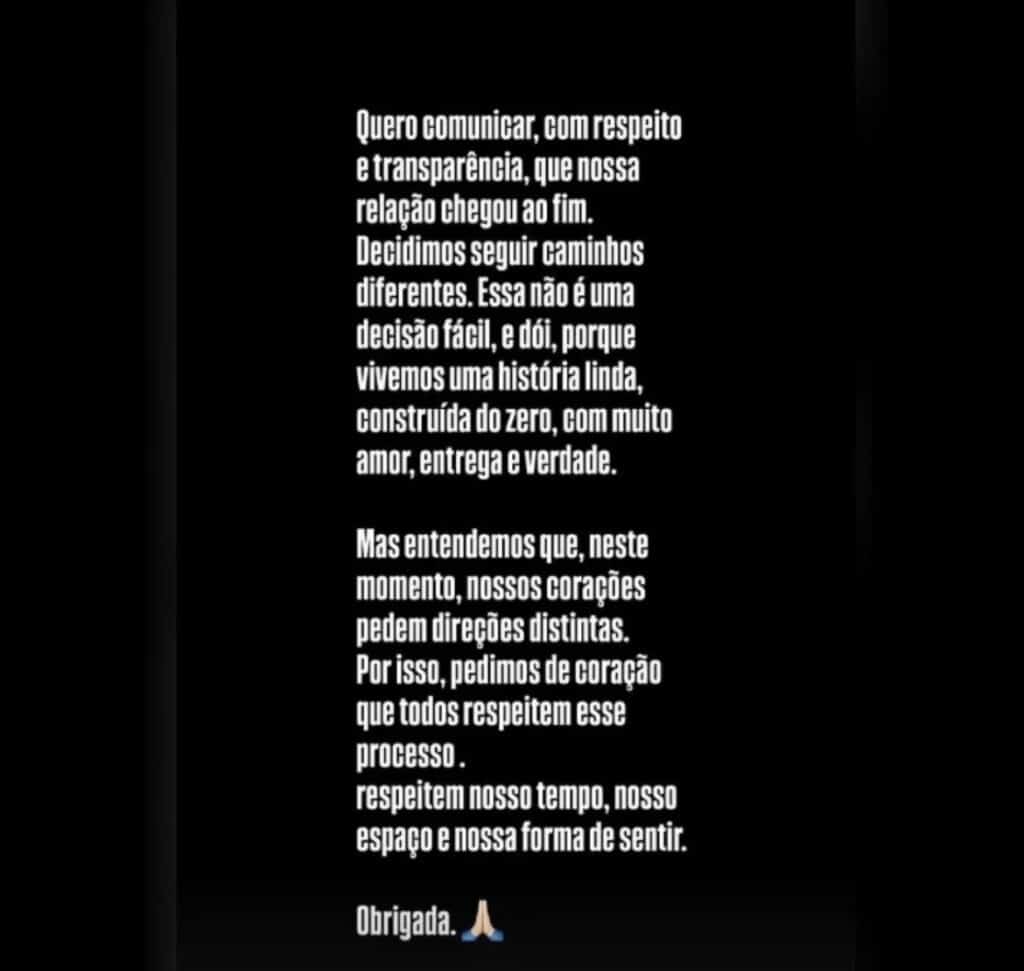 - O casal tem filhos? Até o momento do término anunciado, não há registros públicos de que o casal tenha filhos.