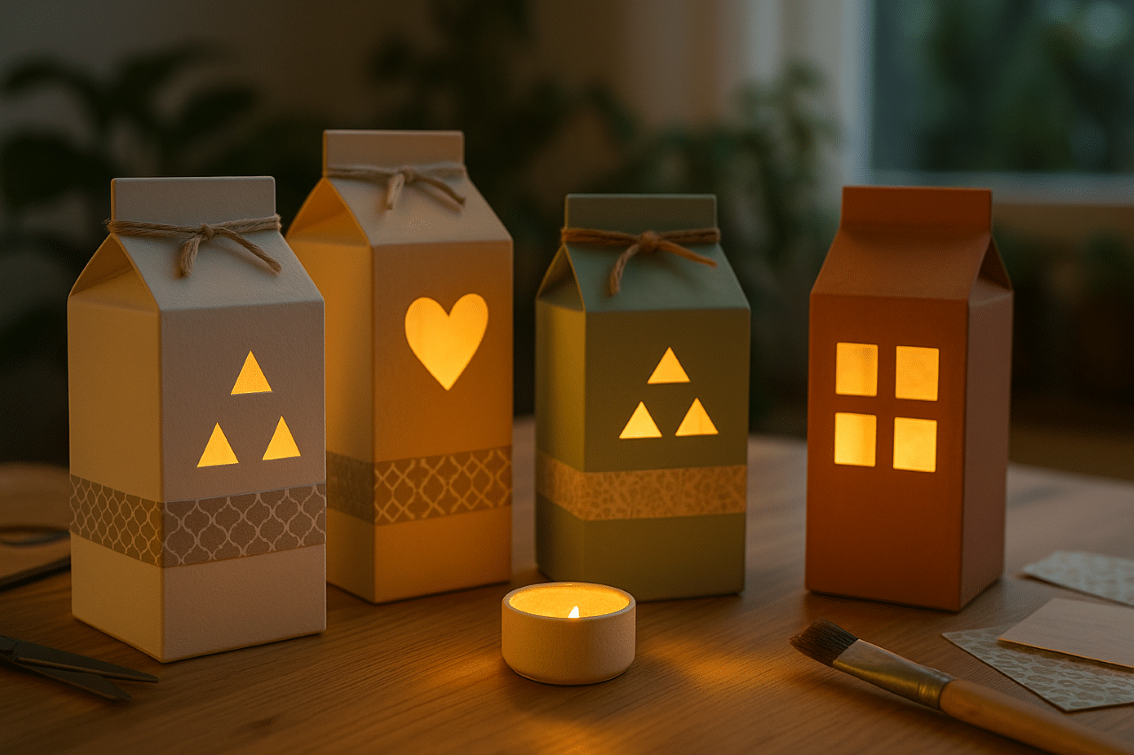 Lanternas artesanais feitas de caixas recicladas com recortes iluminados