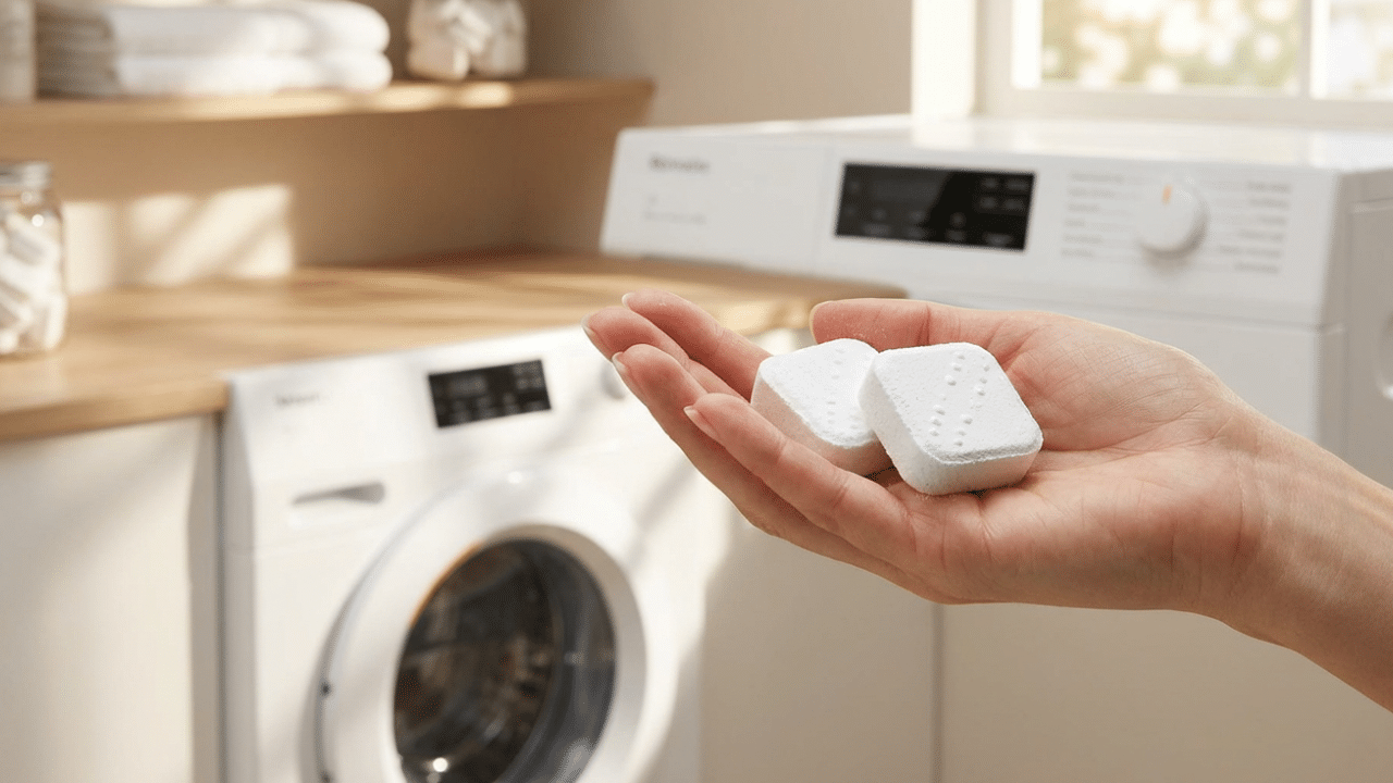 Pastilhas efervescentes para máquinas são usadas para limpeza profunda, eliminando sujeira, germes e odores.