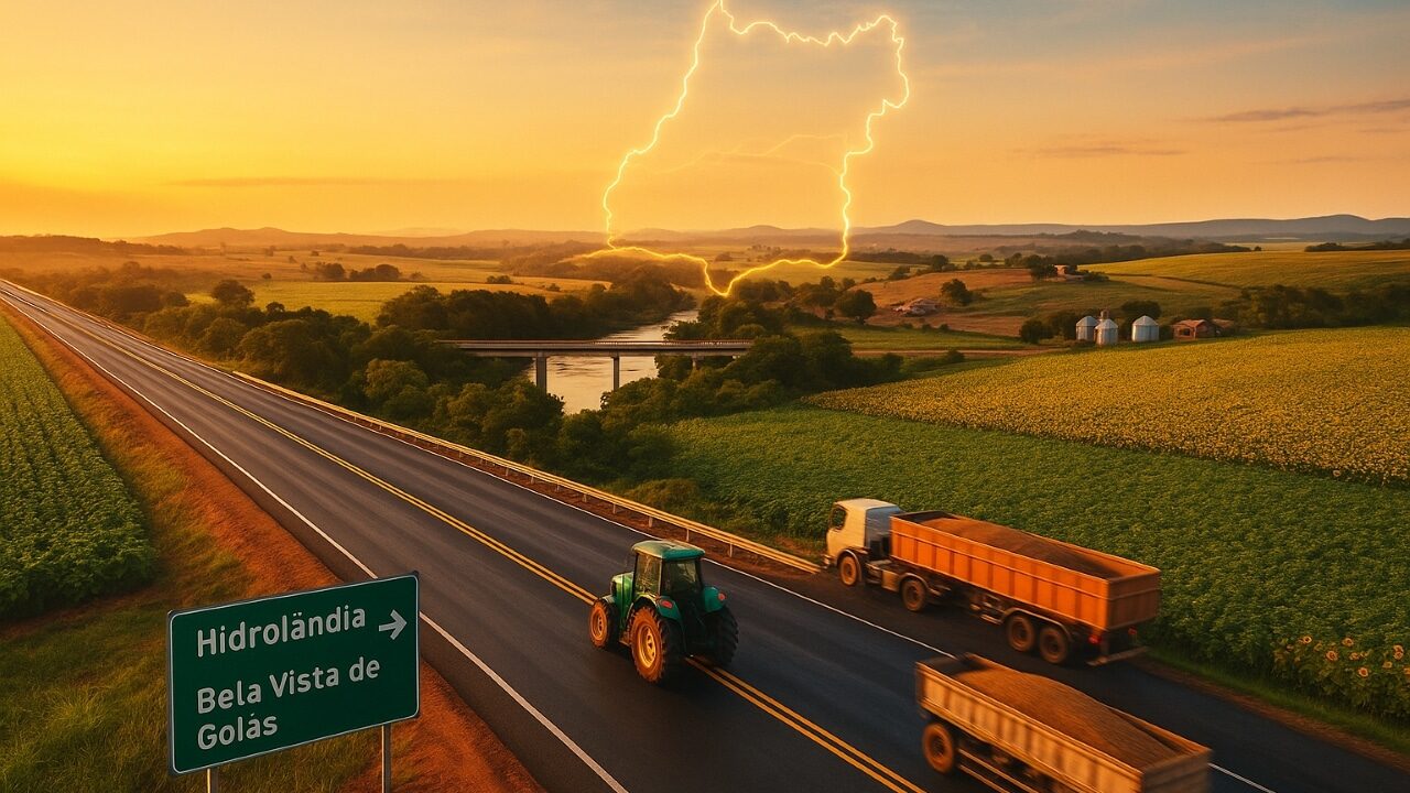 Rodovia em Hidrolândia, Goiás, ao pôr do sol, com caminhões e trator cruzando