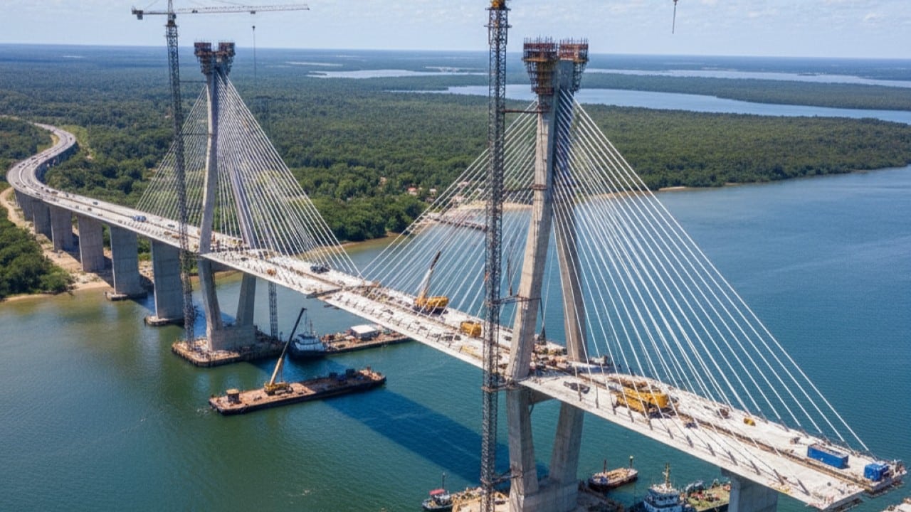 A construção está dividida em dois grandes segmentos: estaiado e pré-moldado. No trecho pré-moldado, já foram concluídas etapas essenciais para a sustentação da ponte, como a instalação de estacas e o lançamento de vigas vitais.