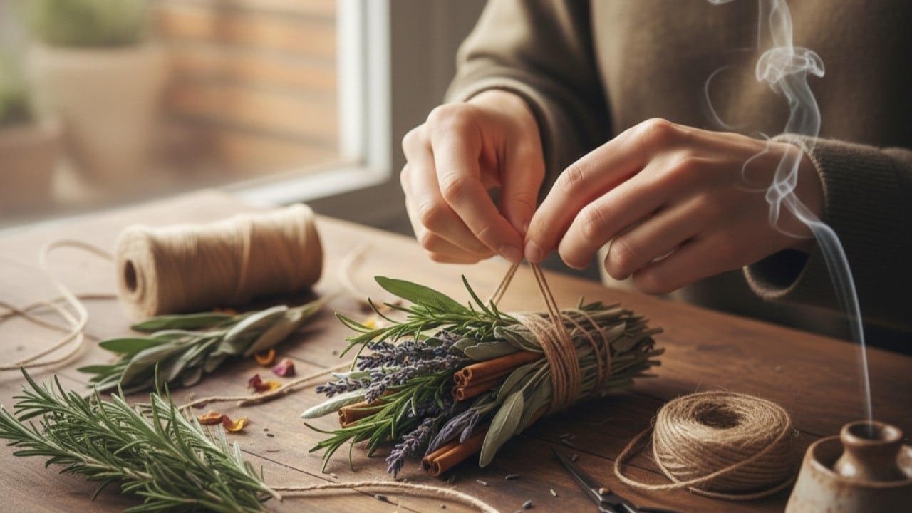 Para preparar incensos em casa, basta reunir materiais acessíveis, como plantas aromáticas (alecrim, lavanda, manjericão), canela e baquetas de madeira. É importante que tudo esteja seco para garantir a queima eficiente.