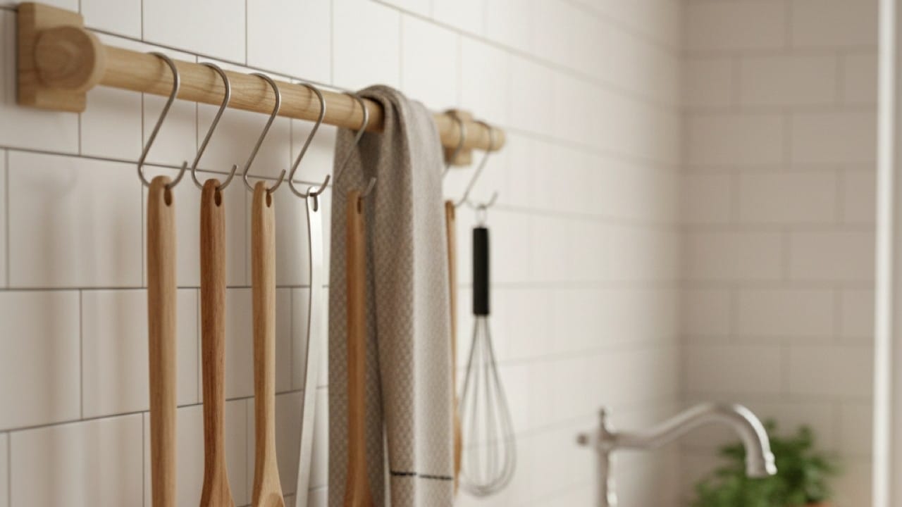 Organizar objetos pode ser desafiador, mas palos de escoba cortados em seções criam organizadores versáteis para cozinha, banheiro ou lavanderia. Fixados na parede, facilitam o acesso a utensílios e acessórios.
