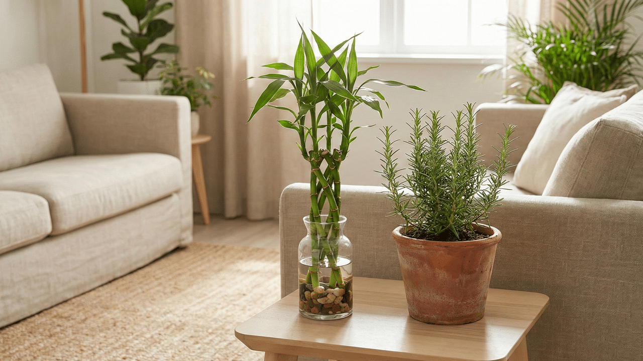 - Bambu-da-sorte (Dracaena sanderiana) – atrai boas vibrações e prosperidade, fácil de manter em água ou vaso.
