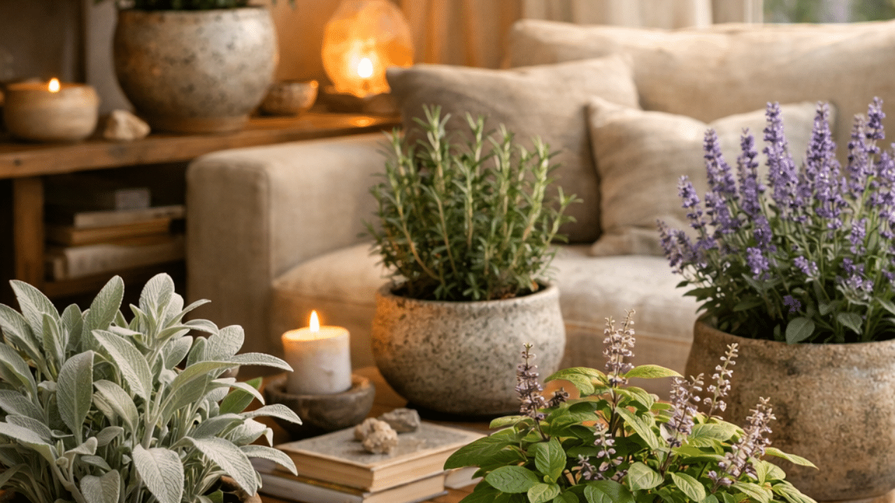 O manjericão sagrado, o alecrim e a lavanda estão ligados ao equilíbrio emocional e à tranquilidade. O manjericão sagrado, também conhecido como Tulsi, é considerado planta sagrada na Índia, simbolizando proteção e harmonia espiritual.