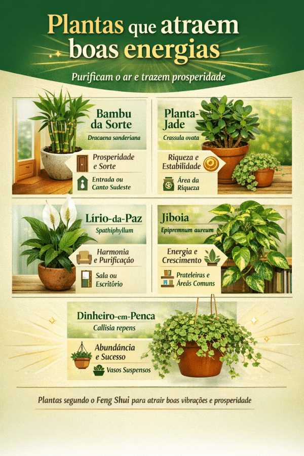 No Feng Shui, filosofia chinesa que busca harmonizar a energia de espaços, plantas possuem papel importante na circulação do “chi”, a energia vital. Plantas saudáveis representam crescimento, vida e abundância, enquanto ambientes com pouca vitalidade podem refletir estagnação emocional e até financeira. Ao posicionar as plantas certas nos lugares adequados, a ideia é estimular fluxo de prosperidade e criar vibrações positivas que favoreçam bem‑estar e equilíbrio no dia a dia.