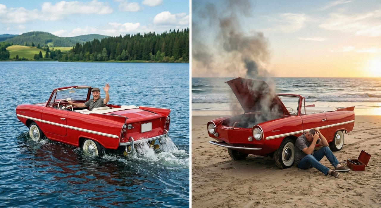 Fabricado na Alemanha durante a década de 1960, o Amphicar 770 é o exemplo clássico de como essa dualidade cobra seu preço na manutenção. Embora tenha sido o único modelo civil produzido em massa, ele exigia que o proprietário engraxasse 13 pontos diferentes da suspensão após cada mergulho para evitar o travamento total.