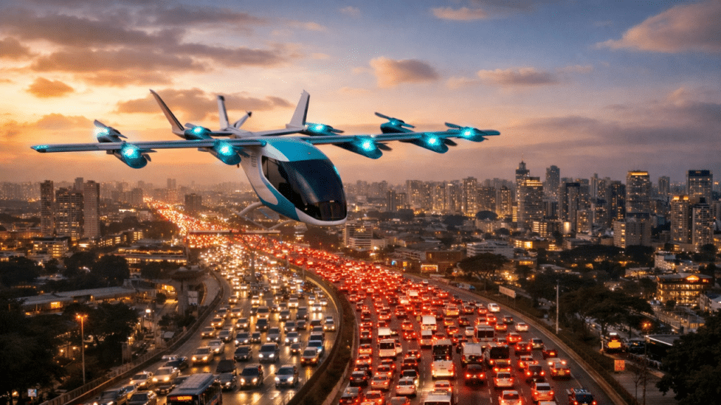 A tecnologia que dominará os céus é o eVTOL (veículo elétrico de decolagem e pouso vertical), que se assemelha mais a um drone gigante do que a um carro tradicional. Esses veículos utilizam múltiplos rotores elétricos para garantir redundância, silêncio e emissão zero de poluentes.
