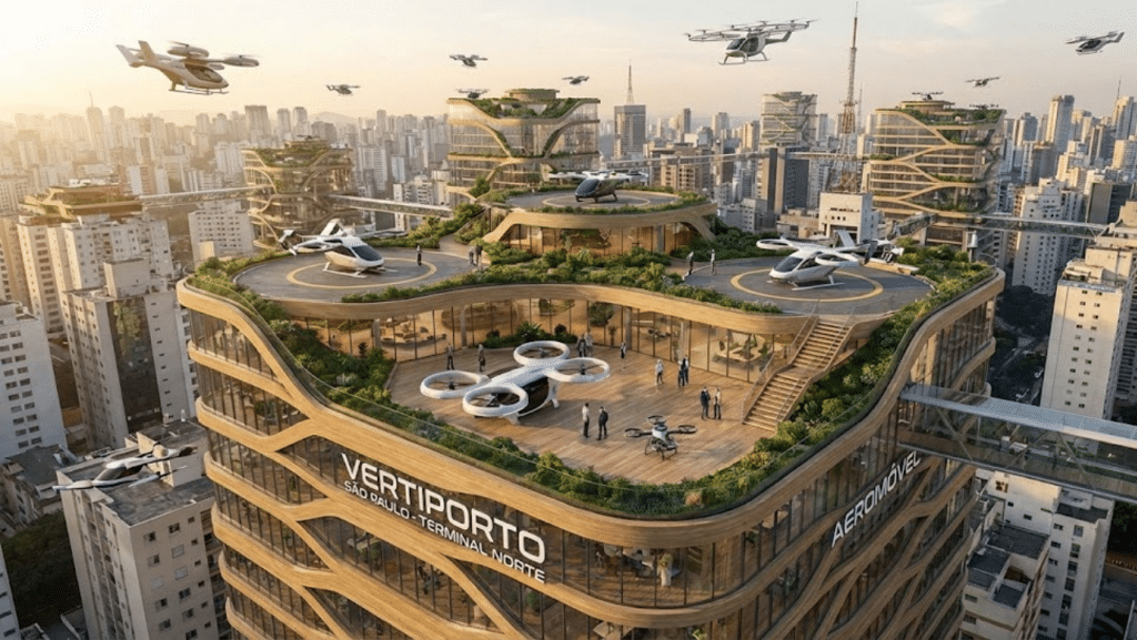Os estacionamentos de rua darão lugar aos vertiportos, hubs de conexão integrados a estações de metrô e grandes edifícios comerciais. A infraestrutura urbana será redesenhada para aproveitar topos de prédios e espaços ociosos como terminais de embarque rápido.