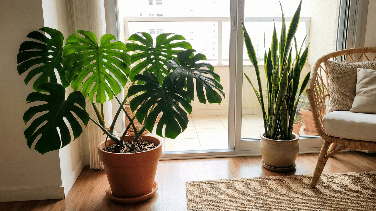 - Posicionamento: coloque a Costela-de-adão próxima a janelas com luz filtrada; a Espada-de-São-Jorge tolera áreas com menos iluminação direta.