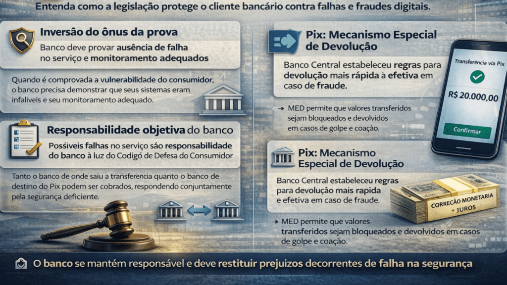 A legislação protege a parte mais vulnerável da relação comercial, garantindo que o cliente não arque sozinho com prejuízos de falhas sistêmicas. A inversão do ônus da prova obriga o banco a demonstrar que seus sistemas eram infalíveis.