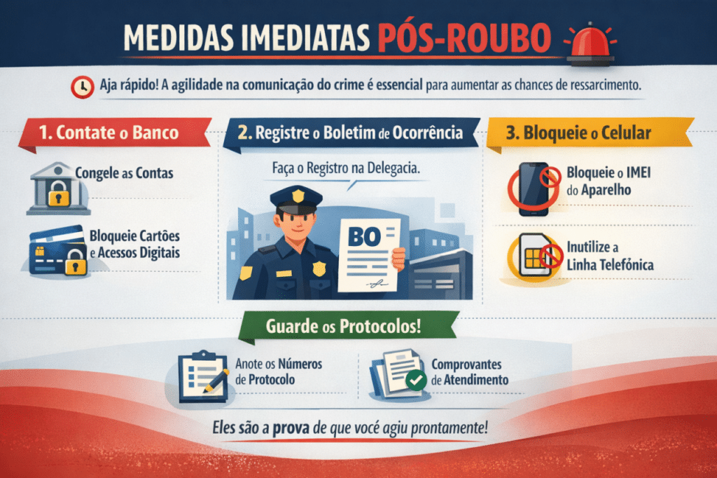 Em situações de roubo, agir com rapidez faz toda a diferença. A comunicação imediata do crime é essencial para reduzir prejuízos, impedir movimentações indevidas e fortalecer eventuais pedidos de ressarcimento. Seguir os passos corretos logo após o ocorrido ajuda a proteger seus dados, seu patrimônio e seus direitos: