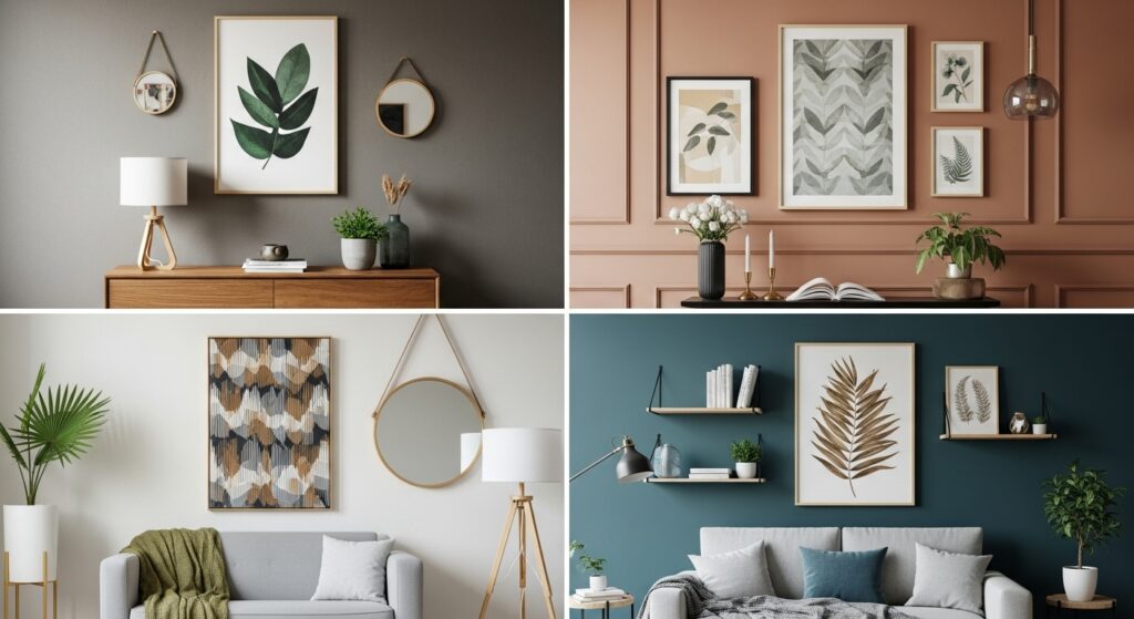 A mistura de fotografias, gravuras e pinturas em tela é uma tendência forte em 2025, pois traz uma camada extra de sofisticação e “alma” ao projeto. O segredo para que essa mistura não resulte em poluição visual é eleger um elemento de repetição, como molduras de mesma cor ou uma paleta de cores análogas entre as obras.