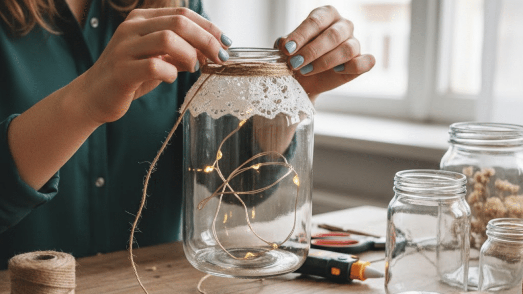 Potes de conserva podem se tornar luminárias encantadoras quando combinados com fios de luz ou velas comuns. Essa adaptação simples cria pontos de luz indireta que deixam qualquer sala ou varanda mais intimista e acolhedora.