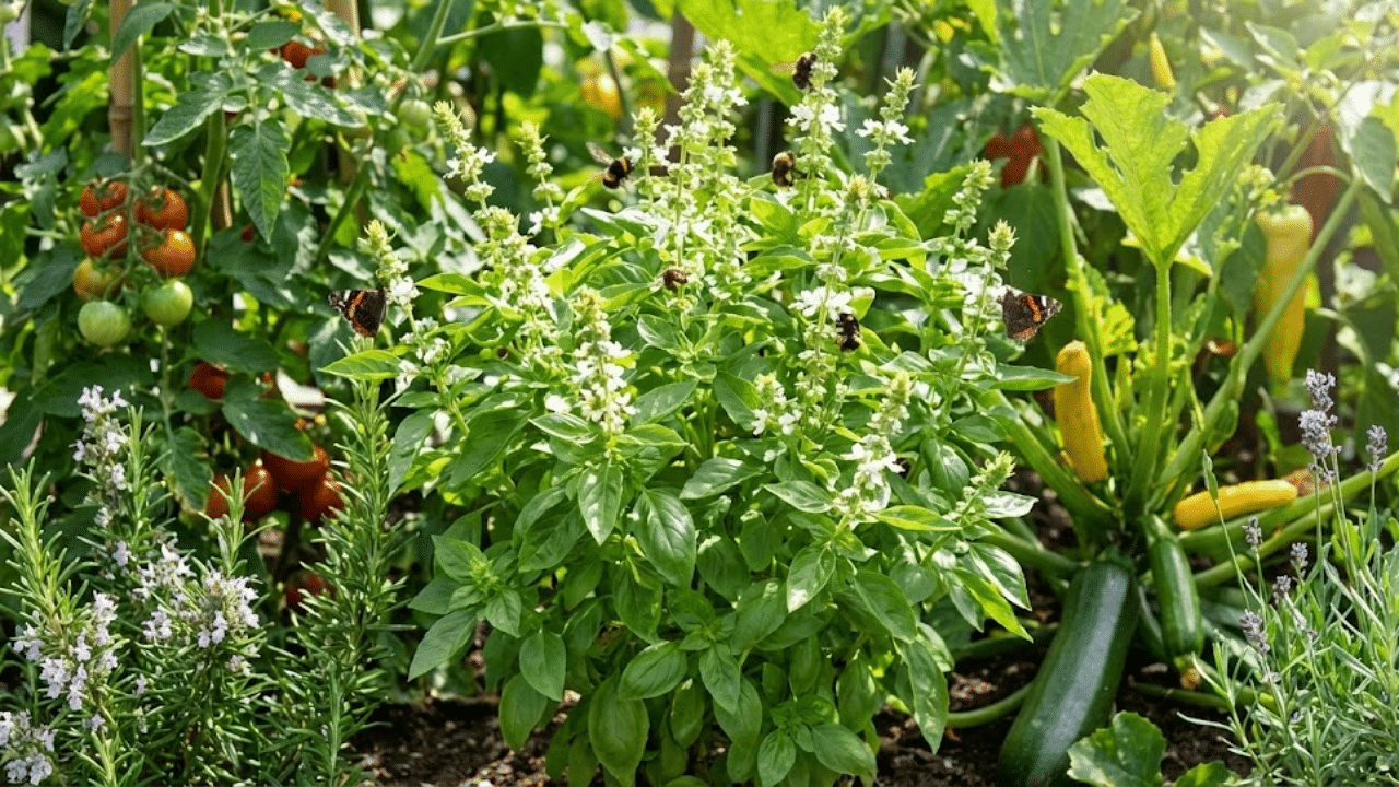 Quando os polinizadores visitam o manjericão, acabam circulando também por outras plantas próximas. Esse movimento aumenta a polinização cruzada, favorecendo florescimento, frutificação e sementes mais saudáveis em toda a horta.