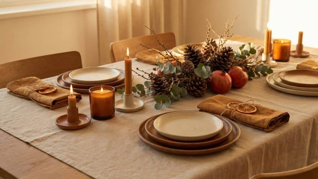 - Montar centros de mesa com pinhas, galhos secos e velas em recipientes de vidro âmbar.