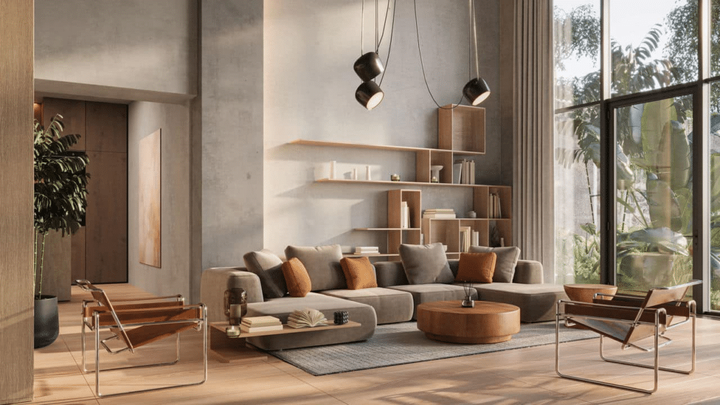 A aplicação do estilo greige estende-se para sofás, cortinas e tapetes, criando uma unidade visual que amplia a sofisticação do mobiliário. Essa escolha permite que itens de maior volume se integrem ao ambiente de forma fluida, mantendo a ordem estética do espaço.