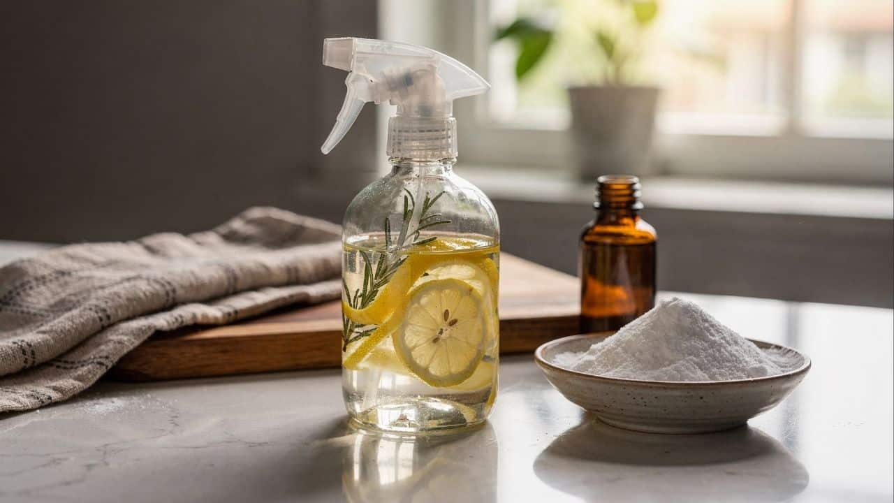 A preparação requer apenas a combinação de partes iguais de água e vinagre num frasco pulverizador de vidro. Esta solução substitui com facilidade os limpa-vidros convencionais e os desengordurantes de fogão, mantendo as superfícies brilhantes sem deixar resíduos tóxicos nos balcões de refeição.
