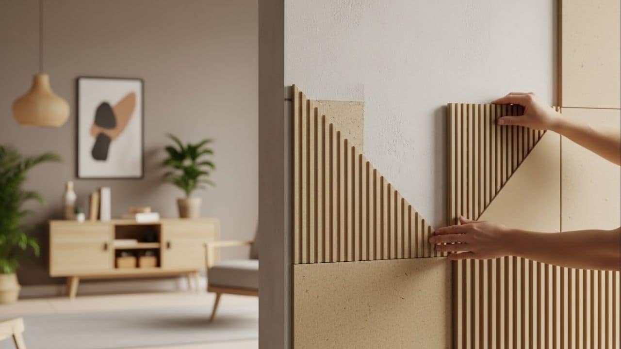 O uso de placas decorativas reutilizáveis de MDF reciclado garante um visual sofisticado com padrões geométricos ou ripados modernos. O material aceita diferentes tipos de pintura e revestimento sem exigir ferramentas complexas para a instalação básica.
