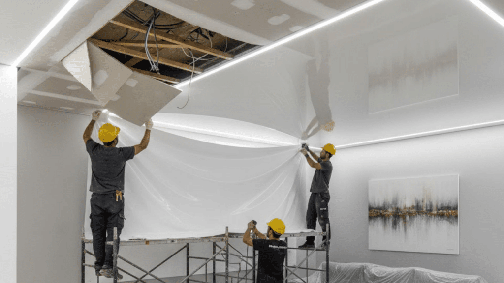 A execução começa com a fixação de perfis de alumínio ou PVC em todo o perímetro das paredes, criando a estrutura que receberá a membrana sob medida. Após o posicionamento, utiliza-se um soprador de ar quente para expandir o material, permitindo que ele seja encaixado perfeitamente nos trilhos laterais.