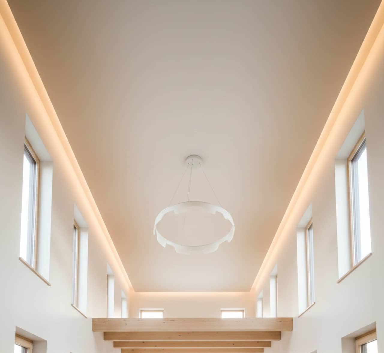 - Um teto neutro sofisticado equilibra o ambiente sem competir com móveis e objetos.