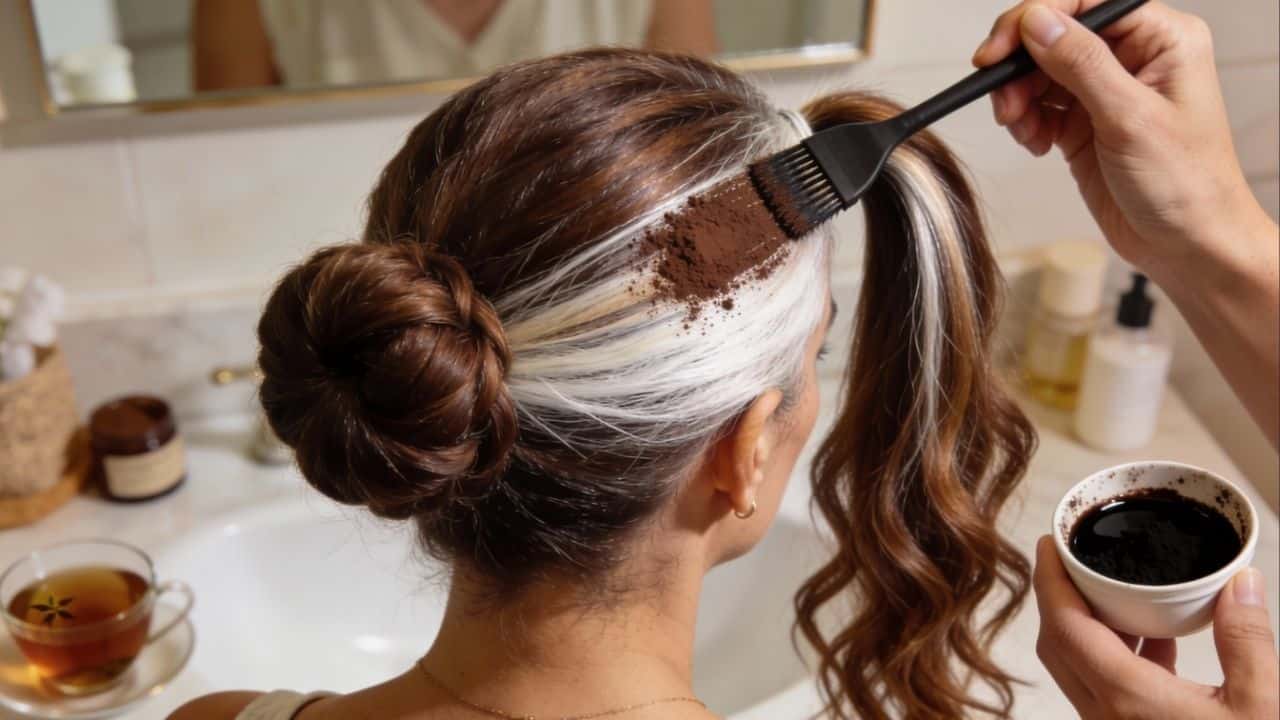 O pó de cacau 100% é um dos truques mais populares para disfarçar brancos rapidamente, principalmente em cabelos castanhos. Ele funciona como uma maquiagem capilar, criando uma camada de cor superficial que se mistura com o tom natural e reduz o contraste dos fios brancos, ideal para aquele retoque emergencial antes de sair.