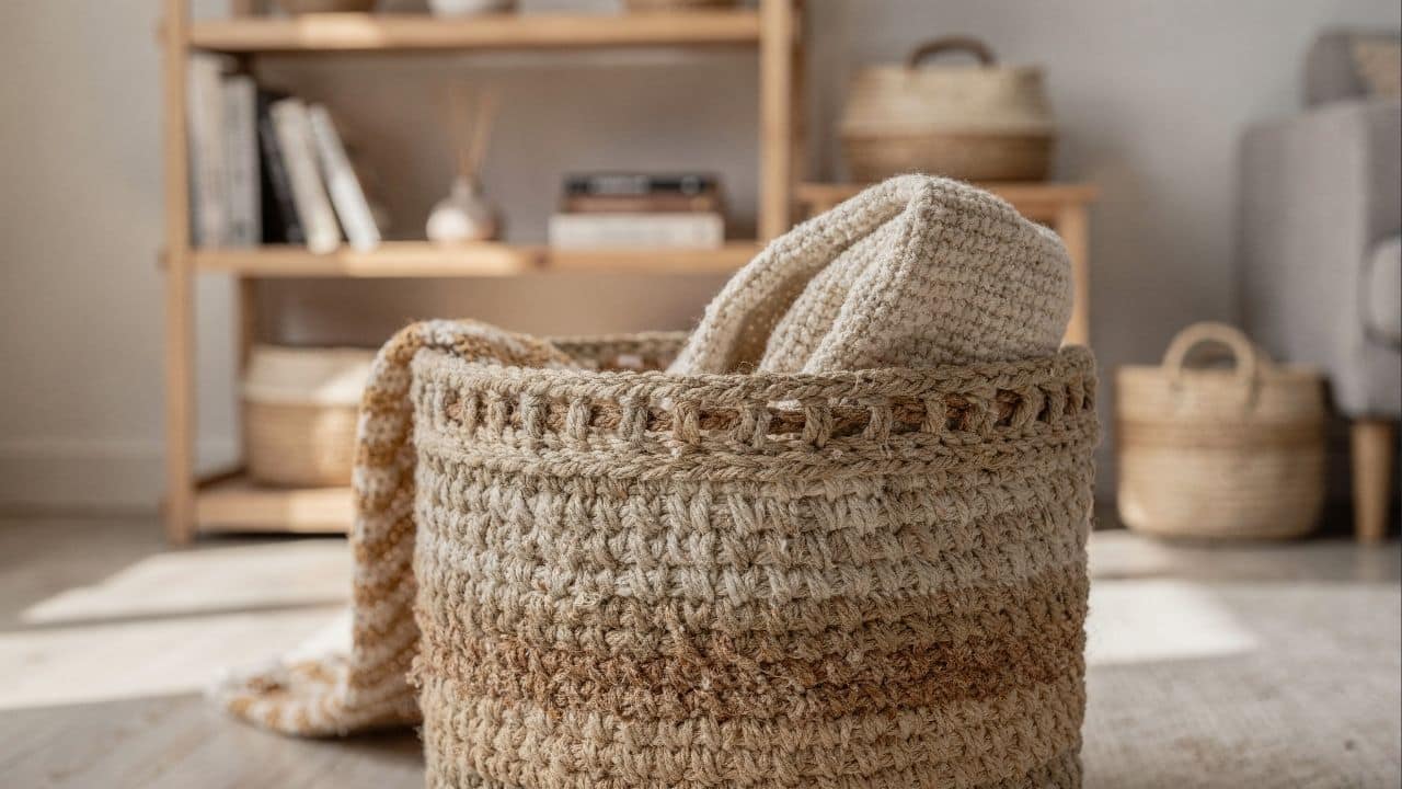 Uma boa estratégia é repetir a cor do cesto em almofadas, quadros ou tapetes para criar ligação visual. No acabamento, vale esconder emendas, reforçar a borda com uma leve dobra e aceitar pequenas variações no trançado, que valorizam o caráter manual da peça.