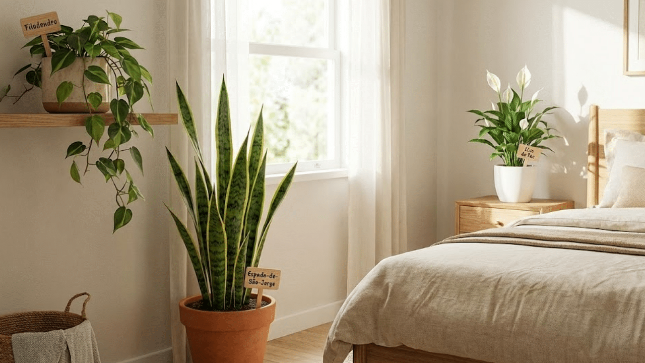 A combinação de plantas para quarto com móveis funcionais e cores suaves indica que, em 2026, o dormitório se consolida como área de recuperação e cuidado com o corpo. Espada-de-São-Jorge, filodendro e Lírio da Paz respondem a essa demanda de forma direta e simples.