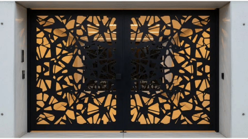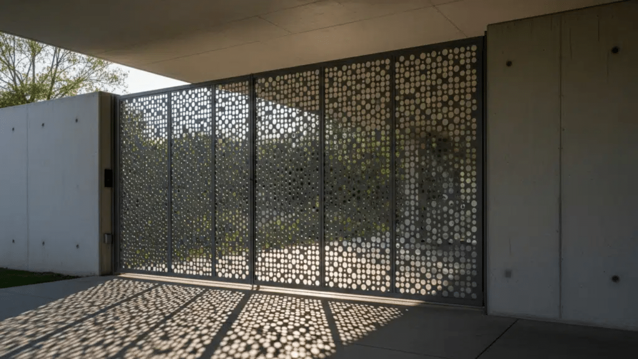 O painel de aço ou alumínio trabalhado com microfuros cria uma barreira visual que impede a visão de quem está fora, mantendo a visibilidade de quem está dentro. Diferente das grades comuns, esse material elimina a sensação de prisão e integra a segurança à arquitetura da residência.