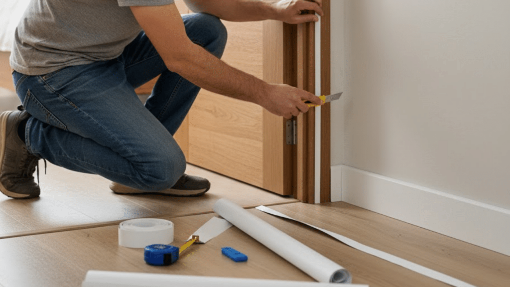 Aplicar o acabamento exige apenas atenção ao alinhamento e uma superfície livre de poeira para garantir a fixação máxima da cola adesiva. O processo dispensa ferramentas pesadas, bastando um estilete afiado e uma trena para realizar os cortes nos cantos e finais de parede.