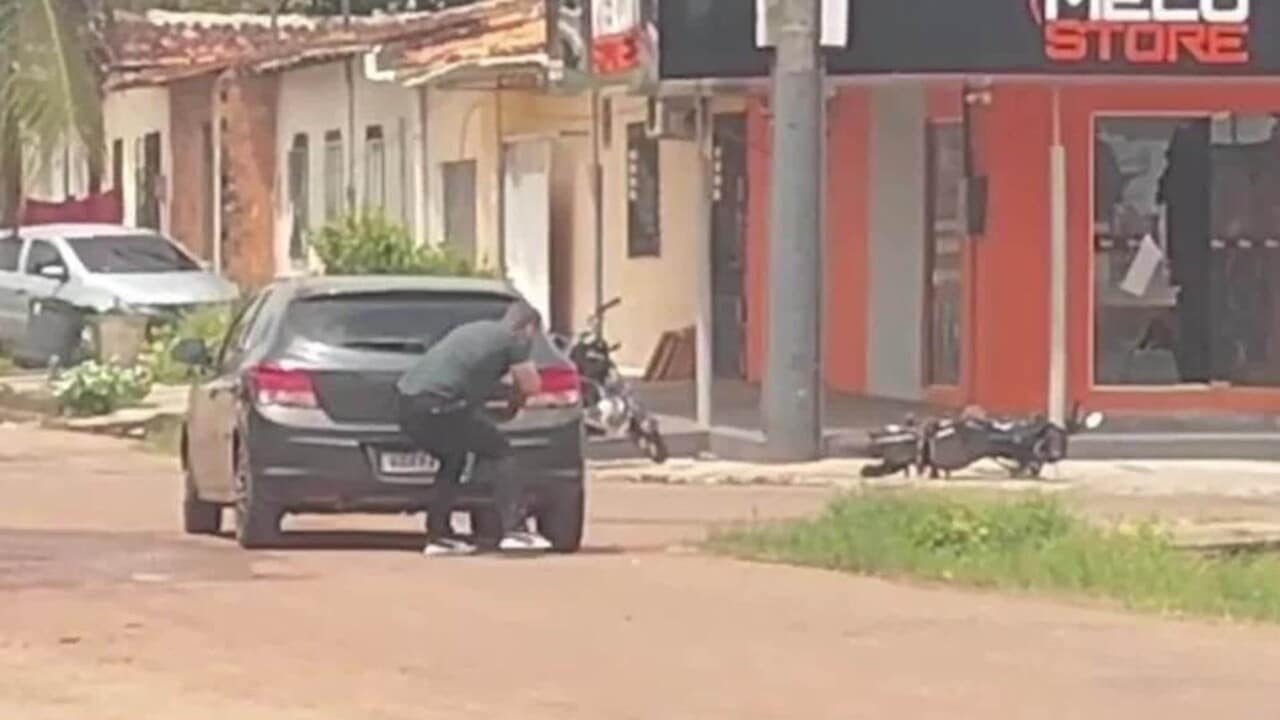 As imagens mostram o momento em que a tentativa de roubo é interrompida por um homem que seria soldado da Polícia Militar. O policial chega em um carro preto, desce armado e atira contra o suspeito que está na motocicleta, dando início a um confronto armado em plena área urbana e provocando correria entre moradores e comerciantes. Veja as imagens abaixo (Reprodução/X/@TumultoBR):