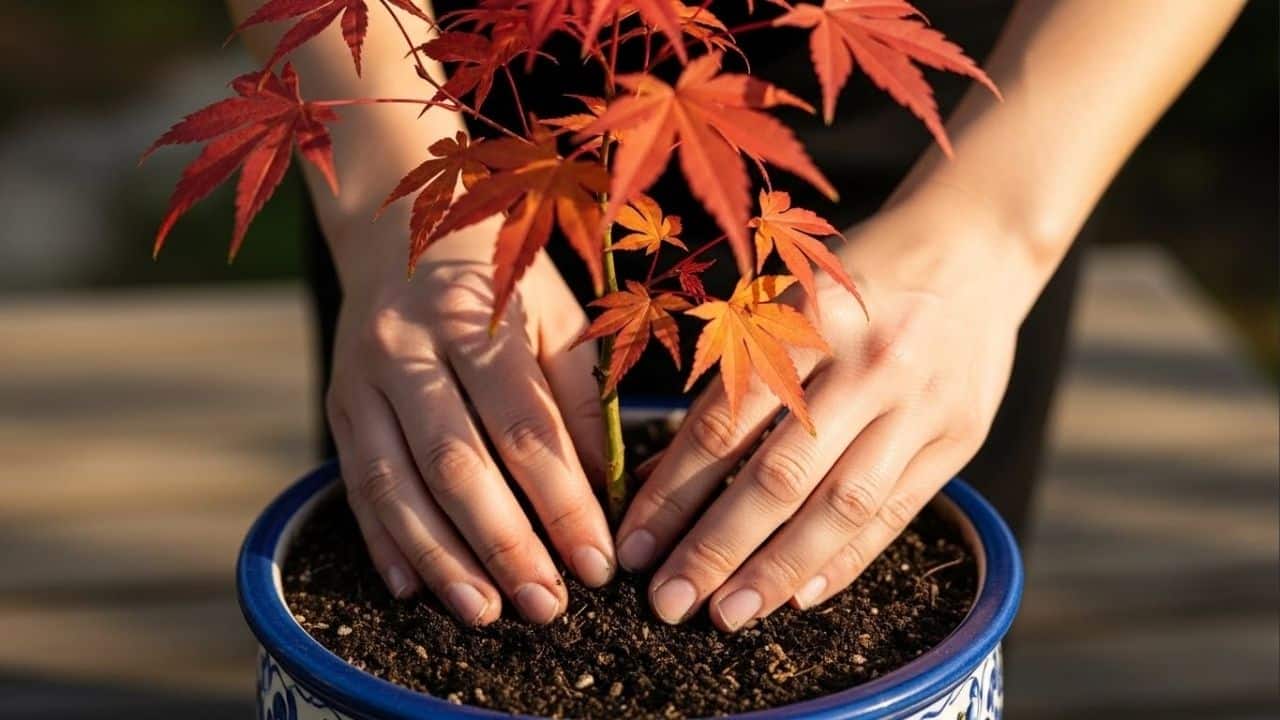 4. Plantar o Acer palmatum mantendo o colo da planta no mesmo nível em que estava no recipiente original.